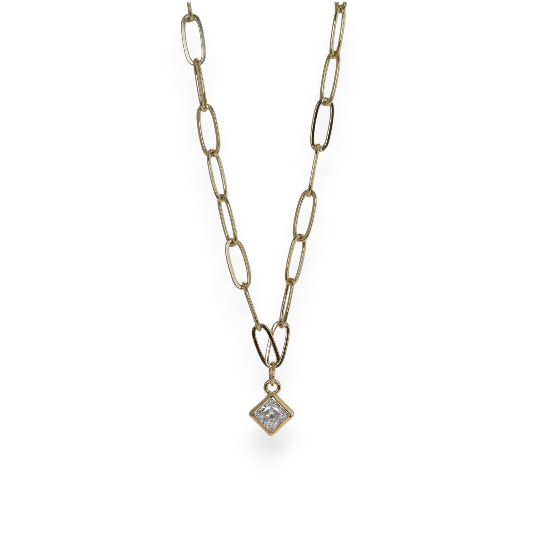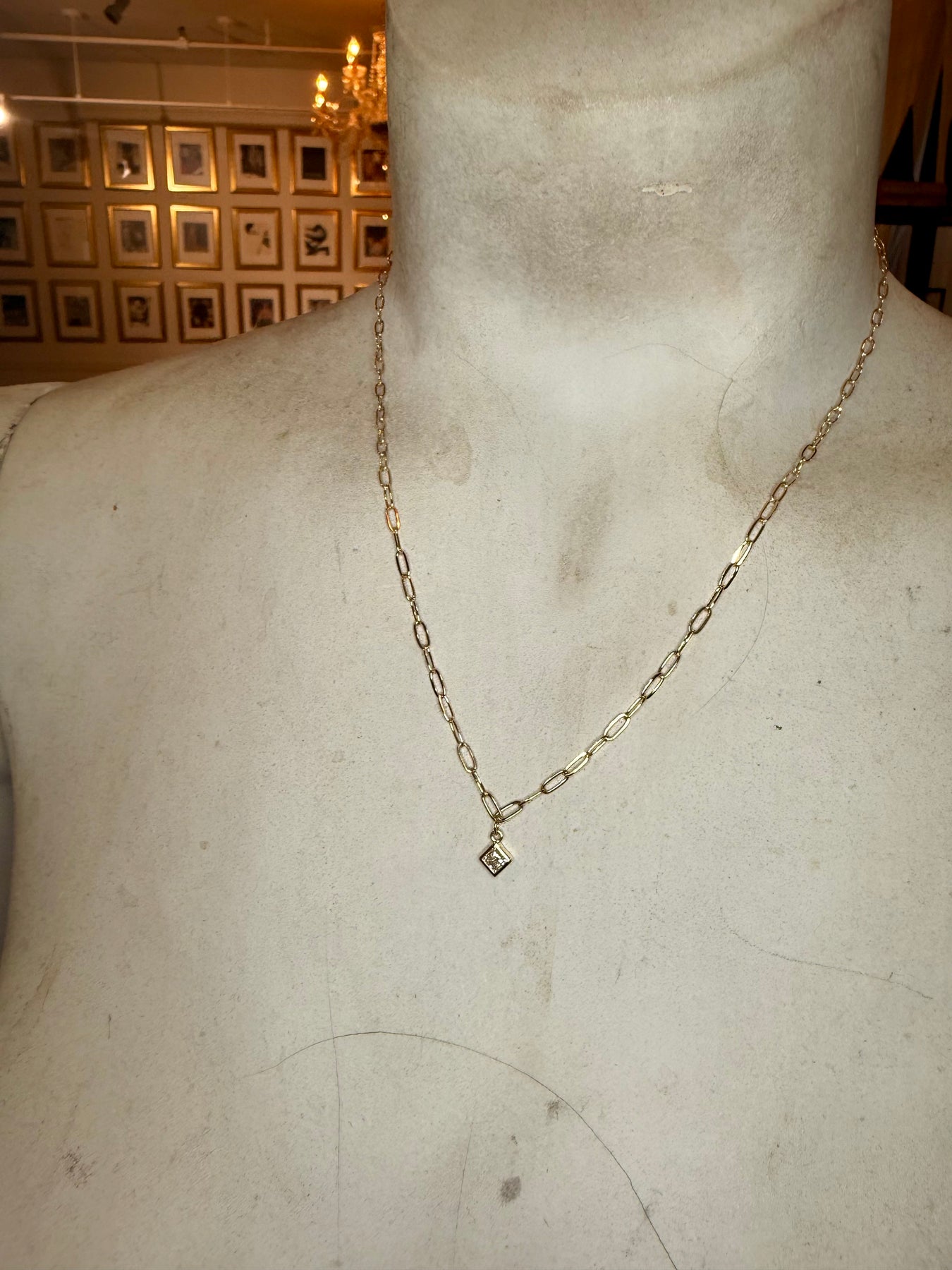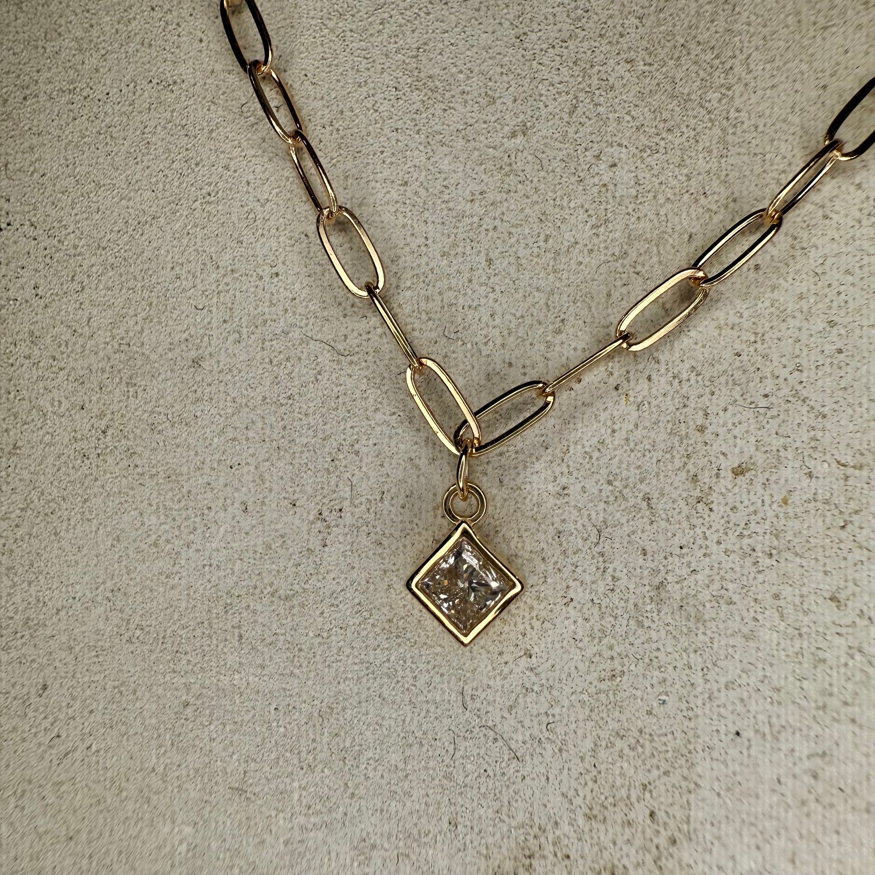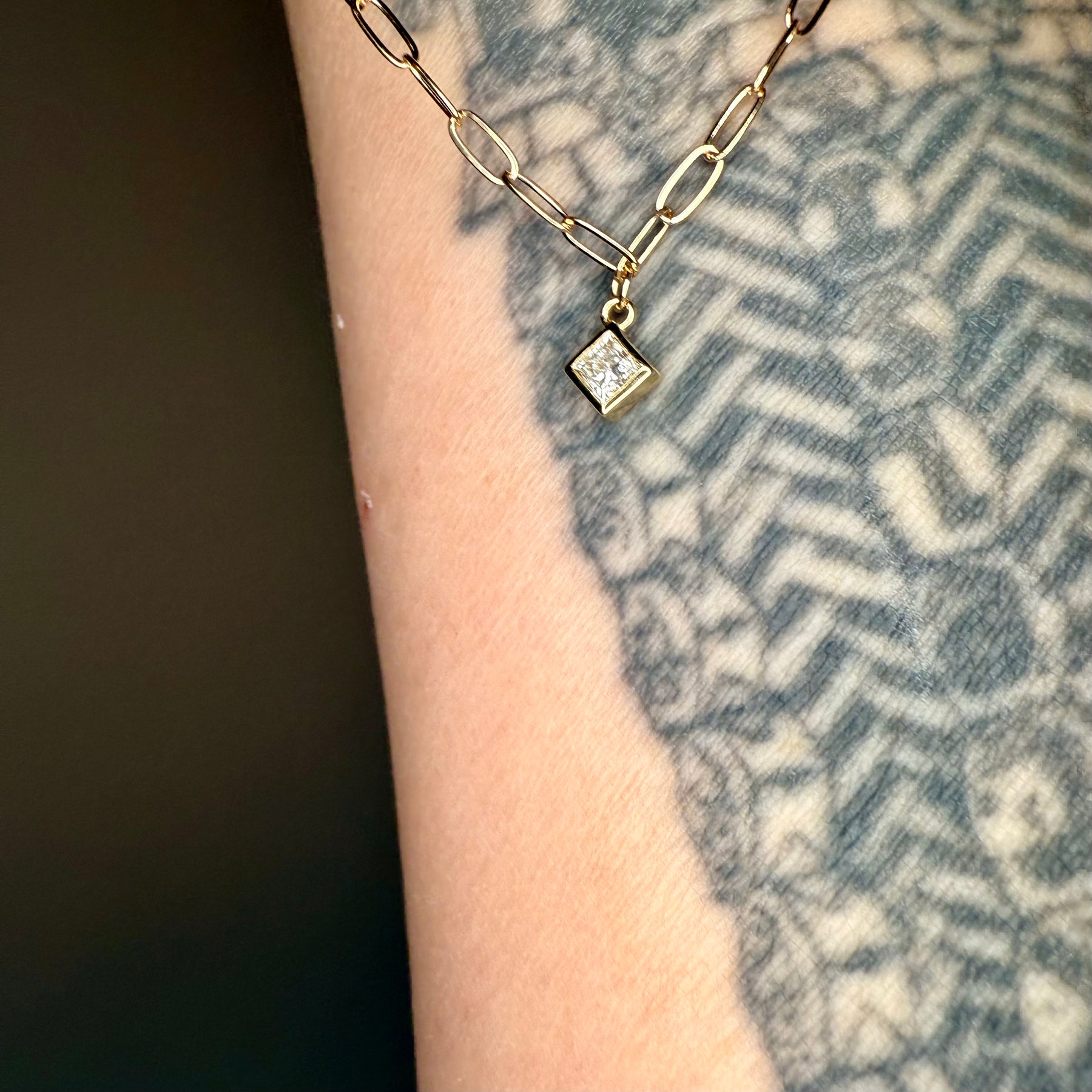 At the center sits a 3×3mm natural square diamond, bezel-set for a clean, modern profile. This geometric shape adds a refined architectural note that complements both delicate chains and more statement layers.